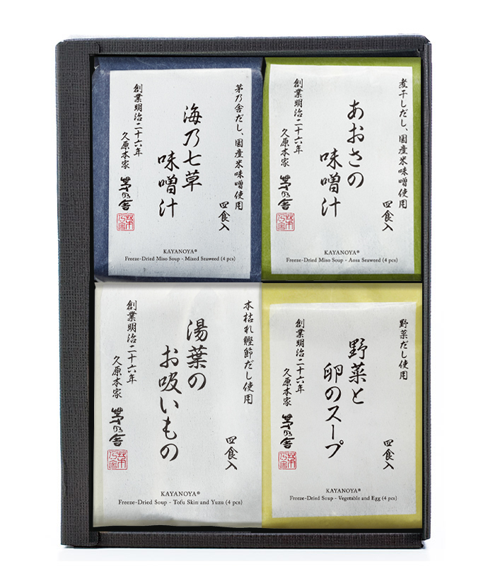 - 茅乃舎だしに米味噌を合わせました。とろろ昆布など7種の海草を使い、磯の風味豊かに仕上げたフリーズドライの味噌汁です。