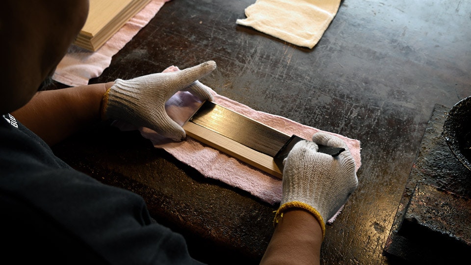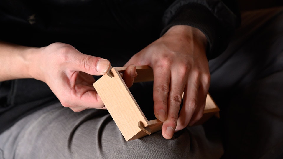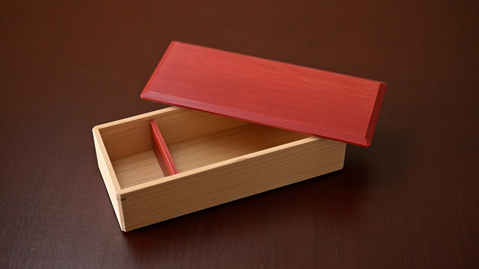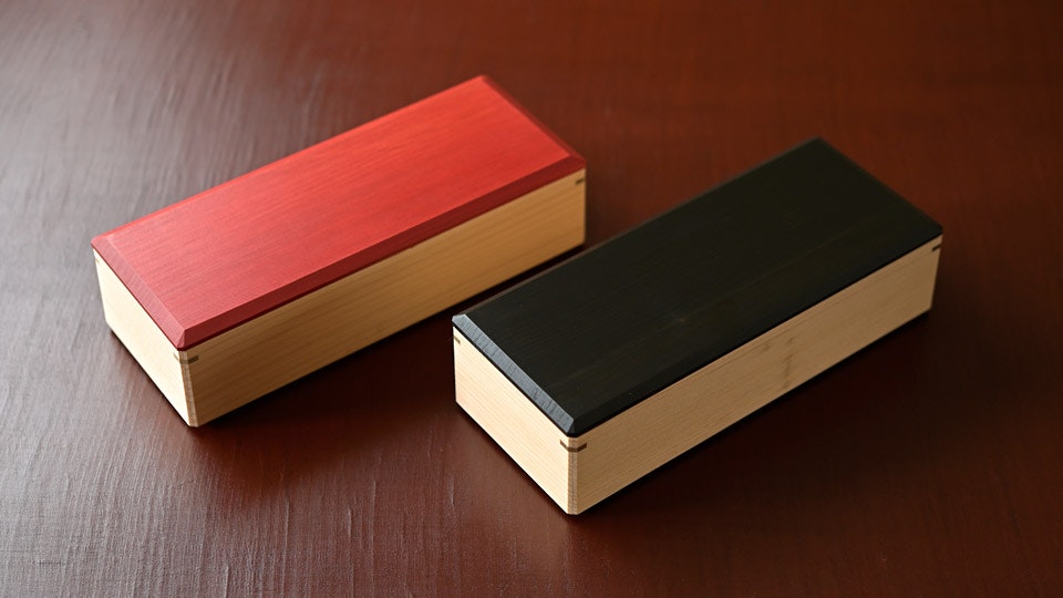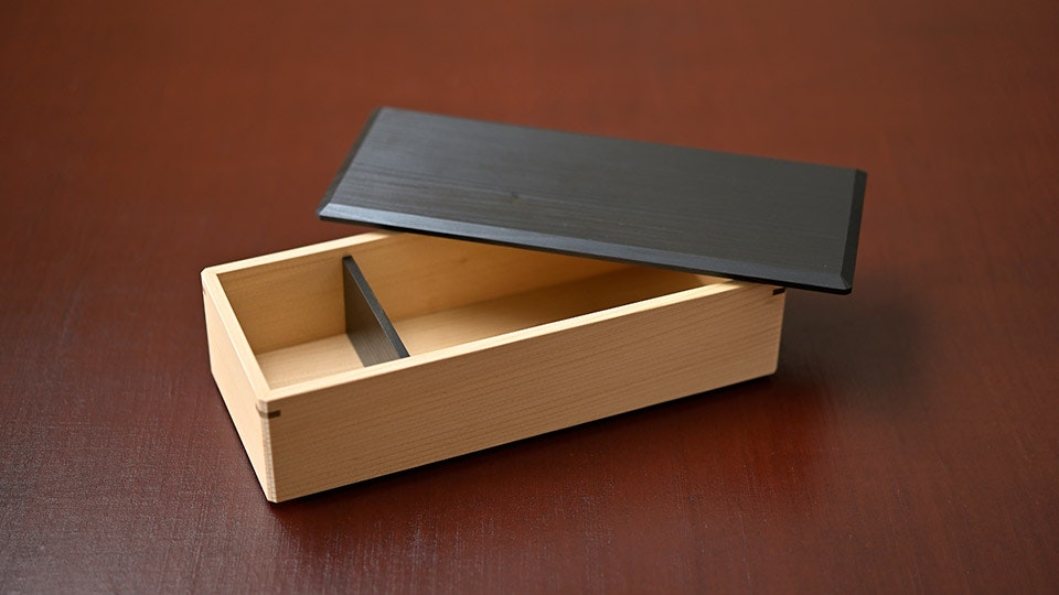 木材を加工しカットしたら、4枚の板で箱を組む。この時、なるべく木目や表情が揃うようにする。組みの良し悪しが耐久性に直結するため、精度高く加工できるカンナで少しずつ削りながら、ピッタリ合うよう調整を加える。四隅を留める朴(ほお)の木は、箱としての強度を高めると同時に、精緻な手仕事を際立たせる。この箱を、拭き漆を3度重ねた蓋で閉じる。蓋と箱の締まり具合もカンナで調整し、緩すぎず固すぎず、丁度いい塩梅に仕上げる。