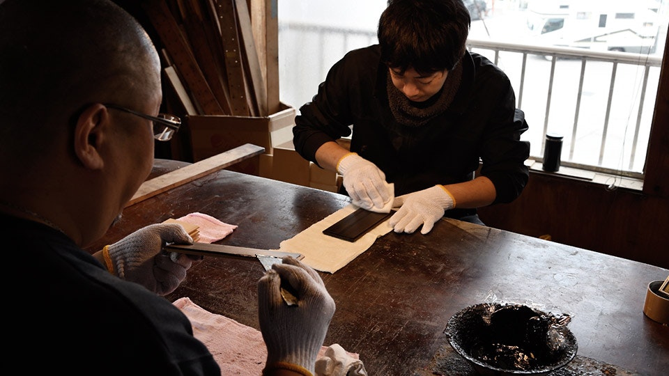 ヘラを使って漆を塗り込んで、余計な漆を拭き取る拭き漆。これを3度繰り返して蓋を仕上げる。