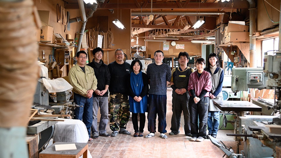 木地職人や塗り職人といった輪島キリモトのスタッフのみなさん。この日、7代目の桐本泰一さんは出張中で不在。中央の7代目の奥様、桐本順子さんが案内してくれた。