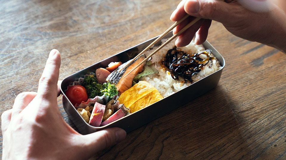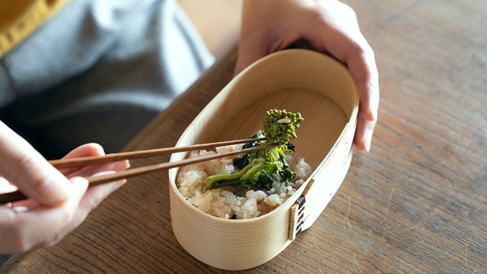 「あ、シャケが入ってる」。弁当を開けた西田さんの顔がほころんだ。「今日の撮影用に、奥さんが豪華にしてくれたかな?」。弁当箱に添えられた竹箸は、ちょうど弁当箱に収まる長さ。食卓で邪魔にならない取り箸にするための19cmの長さは、なるほど弁当箱に携行しやすく、また、子ども用にも適したサイズだ。