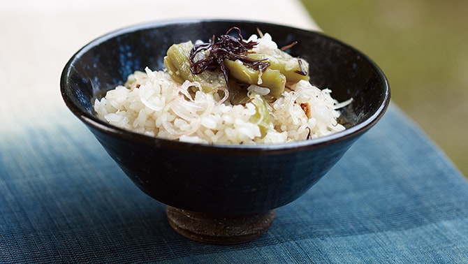 香ばしさをまとった茄子の皮と、だしがよく染みた茄子の実。夏の茄子を味わい尽くす「茄子ごはん」を、お楽しみください。