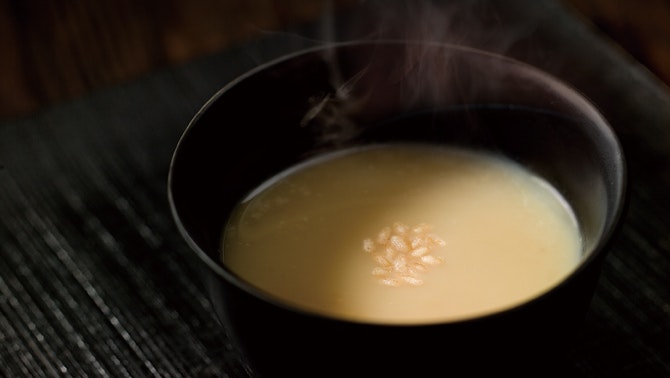 「御料理 茅乃舎」では、ずっと大切にしてきたお料理があります。そのひとつがスープ「大地の恵」。肉類を使わないこのスープは、大根、人参、牛蒡などの根菜類を細かくつぶしたり、コトコト煮たり、あらゆる調理法でうまみを引き出しています。一見すると、実に素朴。ですが、野菜の甘み、うまみ、香ばしい香りが溶け合い、大地の力がぎゅっと詰まっています。
