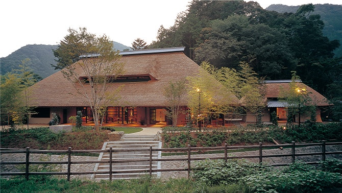こんな山奥に本当に?そんな不安がよぎる頃、大きな茅葺きの屋根をご覧いただけるでしょう。屋根の高さ11.5m、幅37.5m。名だたる茅葺き職人たちが、80トン分もの茅を担ぎあげ、1本1本ととのえて重ねた夢の束。それが「御料理 茅乃舎」です。蛍が舞う清流のそば。日本の美しい原風景が広がります。