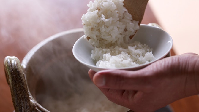 最後にお出しするごはんは、お召し上がりのタイミングに合わせ、ひとつひとつ土鍋で炊き上げます。最もおいしい状態でお出しするために、籾の状態のままで仕入れ、その日の朝に籾すりと精米するのがこだわり。お焦げまでもが、ごちそうです。