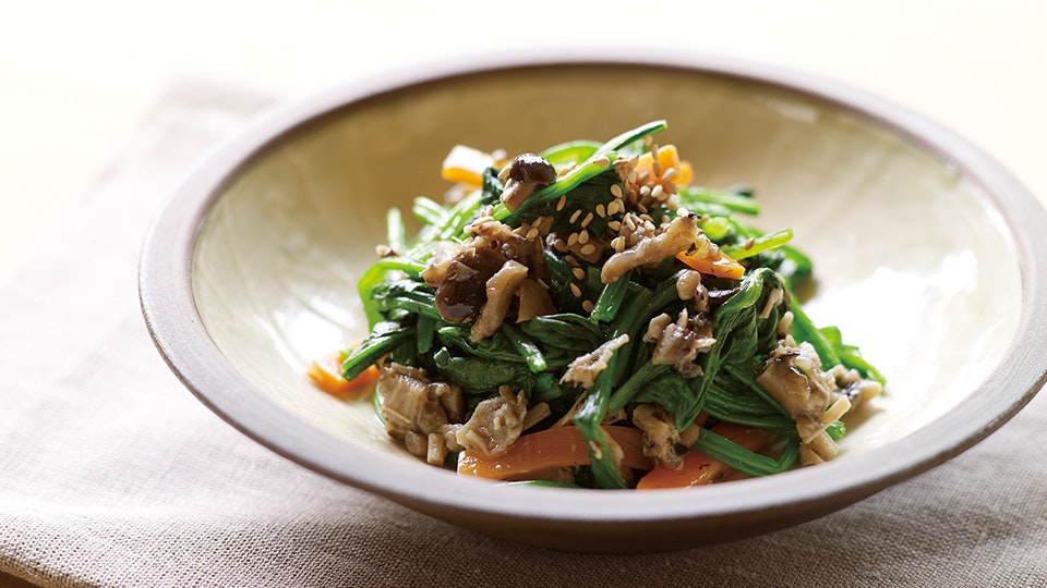 ② ボウルに①を入れ、きのこ味噌で和えて胡麻をふる。