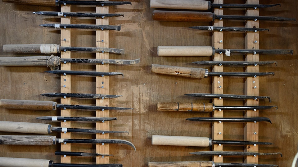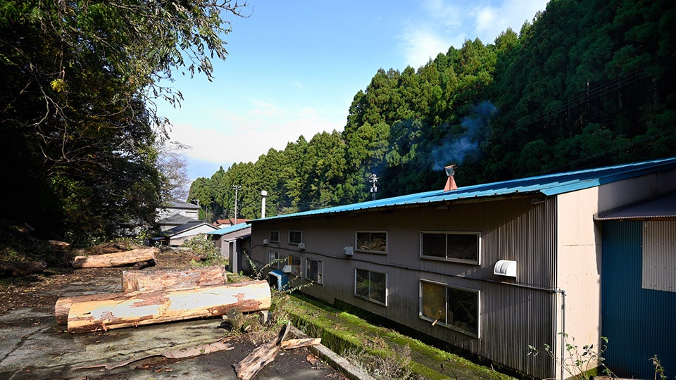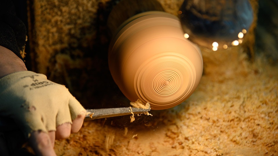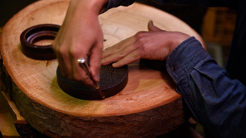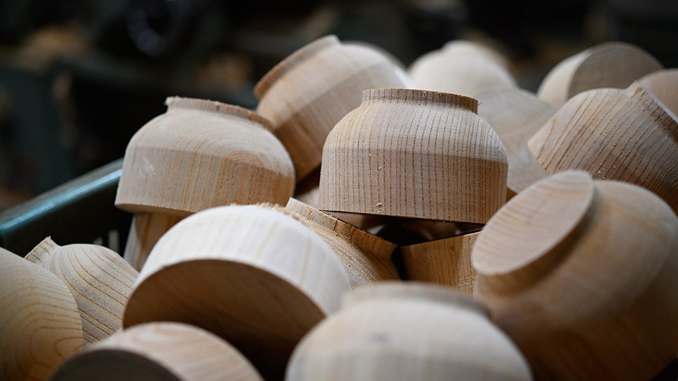 山中漆器は、基本工程の「木地挽き」「下地」「塗り」「蒔絵」など、それぞれ専門の職人が担当する分業制。木地挽きの工程における「縦(たて)木取り」も、山中漆器ならでは。輪切りにした木材から木地を削り出す縦木取りによって、歪みなどの変形が少なく薄口の漆器ができあがるのが強みだ。
