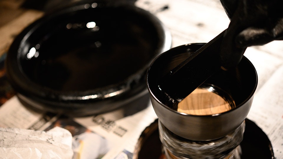 山中漆器の木地加工技術の高さと関係する「塗り」の技法が、「拭き漆」だ。漆器づくりの最終工程である「塗り」において、漆を木地に塗り、余分な漆を拭き取って、乾燥させて仕上げる拭き漆は、木地の木目がそのまま器の模様となる。つまり、拭き漆で仕上げる漆器においては、木地の良し悪しが器の出来に大きく影響する。
