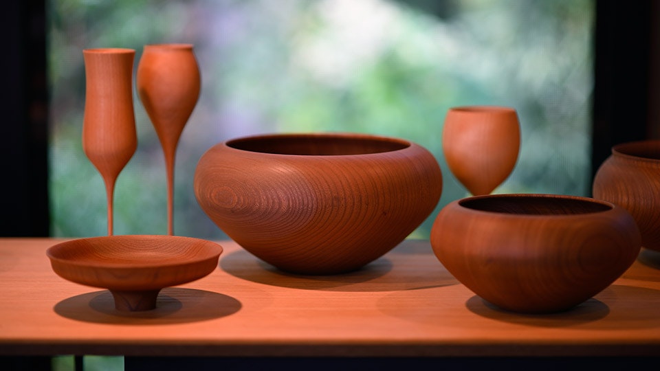 「拭き漆は、木地の完成度が高くなければ成立しません」と語るのは、我戸幹男商店(がとみきおしょうてん)の我戸正幸さん。我戸幹男商店は、1908年に我戸木工所として創業し、現在は漆器の企画や販売を手掛ける山中漆器のブランド。ろくろ挽きによる木地の木目を生かした漆器や、伝統技法と現代的なプロダクトデザインを融合させた独自性の高いモノづくりで知られている。