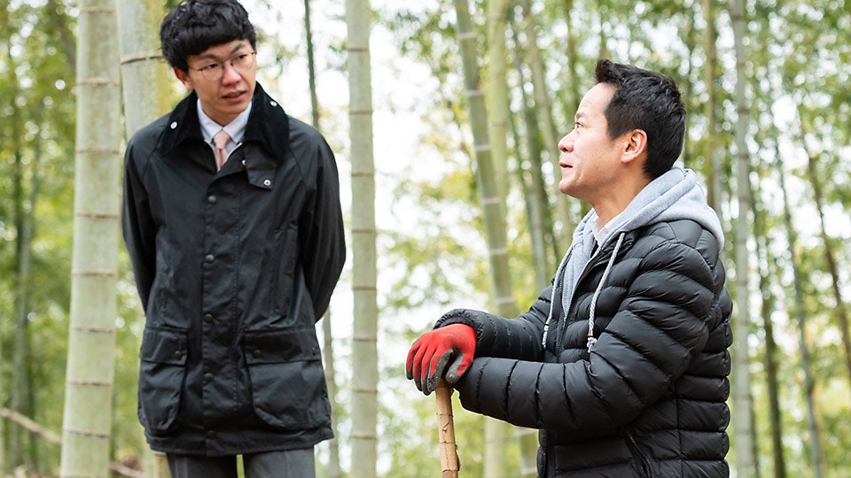 訪れたのは、福岡県八女。八女は、筍の生産量日本一の福岡県の中でも有数の産地として知られている地域で、町中でもたくさんの竹林を見ることができます。さぁ、いざ筍山へ!車が飛び跳ねるような急勾配のでこぼこ山道をぐんぐん登って、山の頂を目指しました。筍の生産者・主計高広(かずえたかひろ)さんにお話を伺います。