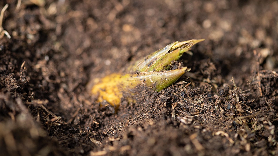 筍は最初に小さな芽が出るんです。地表に近い一番上の小さな筍を早く採ってあげないと、後の筍が大きくならないんですよ。