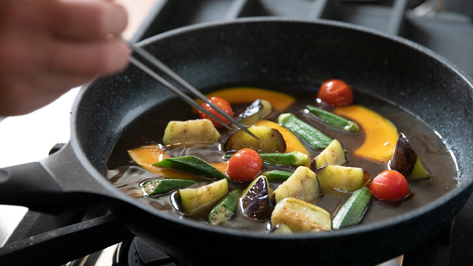 だしのうまみを含みやすい南瓜、茄子、オクラ、ミニトマトは、一度炒めて茅乃舎だしつゆで煮浸し風に仕上げます。最初に多めの油で炒めると、ぐっとおいしくなります。煮出した茅乃舎だしと茅乃舎だしつゆで仕上げたつゆのうまみを、茄子や南瓜にたっぷりと染みこませましょう。