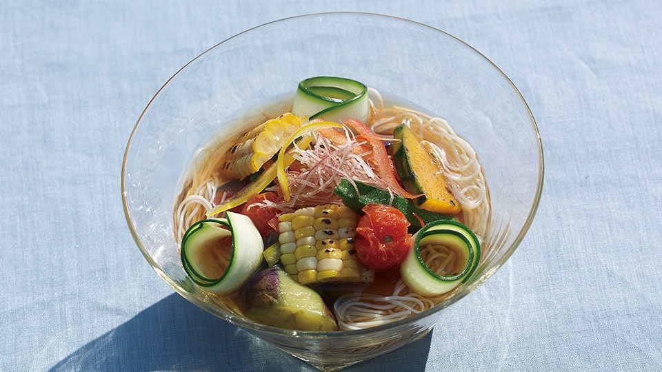 とうもろこしや茄子、オクラなどたっぷりの旬野菜でいただく、ごろり夏野菜の素麺。素麺というより夏野菜が主役、という方がしっくりとくる一品を、「御料理 茅乃舎」料理長・尾﨑が考えました。とうもろこしのスープ、茅乃舎だしつゆのスープと2種の味わいでご紹介します。