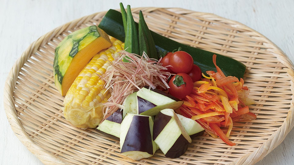 たっぷりの野菜がうれしいですね。夏野菜は、とうもろこし、茄子、ズッキーニ、オクラなど。サラダ感覚で味わう生野菜と、だしに浸す野菜とで味わいに変化をつけていきます。