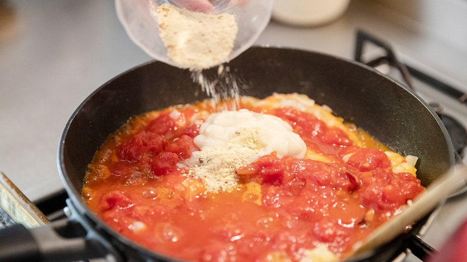 またトマトの酸味消しにお砂糖を入れるレシピもありますが、塩麹だと甘みも十分にあるので、特有の酸味が立ってこないんです。さらに野菜だしが加わることで、複雑なおいしさになるんです。そのまま煮込み料理としてもよいですが、相性がよく、より汎用性のあるパスタ料理に仕上げました。