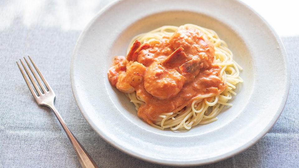 次は、パーティーメニューを意識した「海老の塩麹トマトクリームパスタ」をご紹介します。もともと、トマトと塩って相性がいいんですね。甘みが引き出されるので。