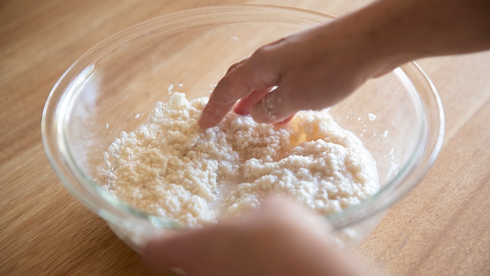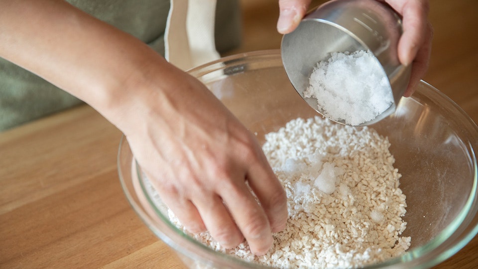 ① 乾燥した板状の麹200gをボウルに入れ、香りがふわっと香るまで手で揉みほぐします。最初からバラの場合、この工程は必要ありません。