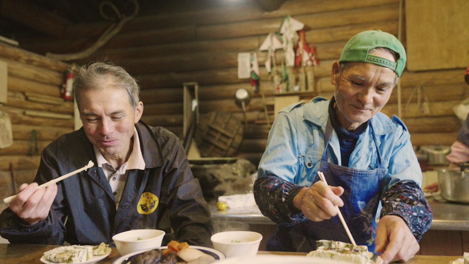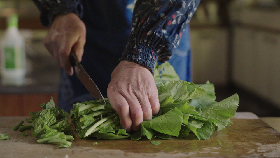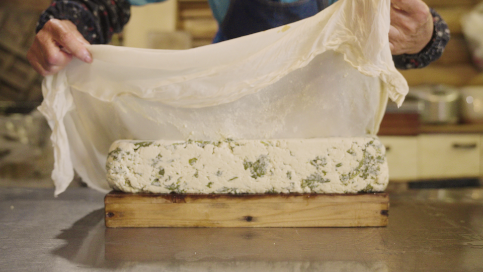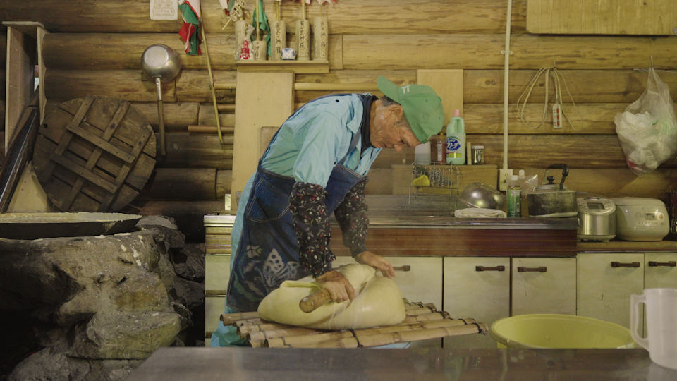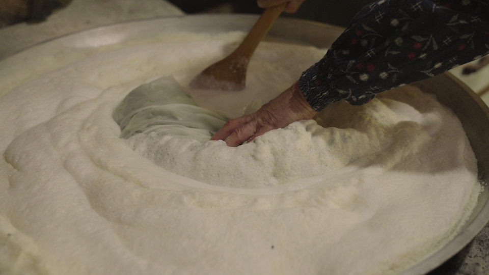 「大豆は貴重品でしたから、カブの葉で少しでもカサを増すという意味も大きいんですが、この味わいが豆腐にが入るのがおいしいんですよ。だから一緒に煮るのが大事ですね。」竹で作った道具「サマ」を使って、全身で力を込めて豆乳を搾ります。煮立てて出来上がったばかりの「ゆるぎ」は、作る過程でしか食べられないご馳走。ゆるいほろほろとした出来立ての豆腐で、熱々でいただくと口の中で大豆と菜っぱのうまみがほどけてゆきます。