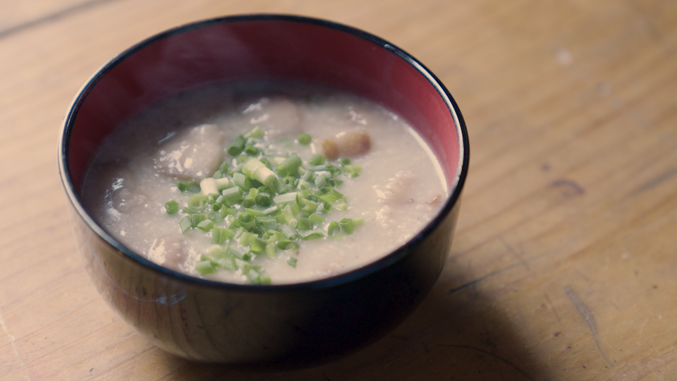 ヒエはそのまま炊いたり、米と混ぜて食べていましたが、椎葉では昔より「ひえずーしい(雑炊)」としても食べていました。勝さんの妻で民宿『焼畑』を共に営むミチヨさんがその作り方を教えてくれました。「ヒエは洗う時にあまり洗い過ぎないようにします。風味がいいから残さないとね。それから猪肉は、焦げるぐらいまで香りが出るよう炒めます。まず米を入れ、米がちょっとやわらかくなったらヒエを加え、じっくり煮ていきます」。途中でアクを取りながら、1時間ちょっと煮たてます。味付けは塩のみ。ヒエの風味と猪肉の旨味が染み込んだ、滋味溢れるおいしさです。「あなたたちが来てくれたので、今日は猪肉が多めなの」ミチヨさんは優しく微笑んでくれました。