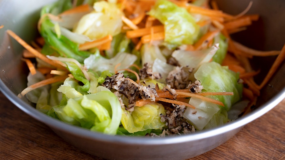 と、主婦の味方minokamoさん。うま煮で使った椎茸だしのだしがらを、残りの浅漬けキャベツに加え、付け合わせにしました。
