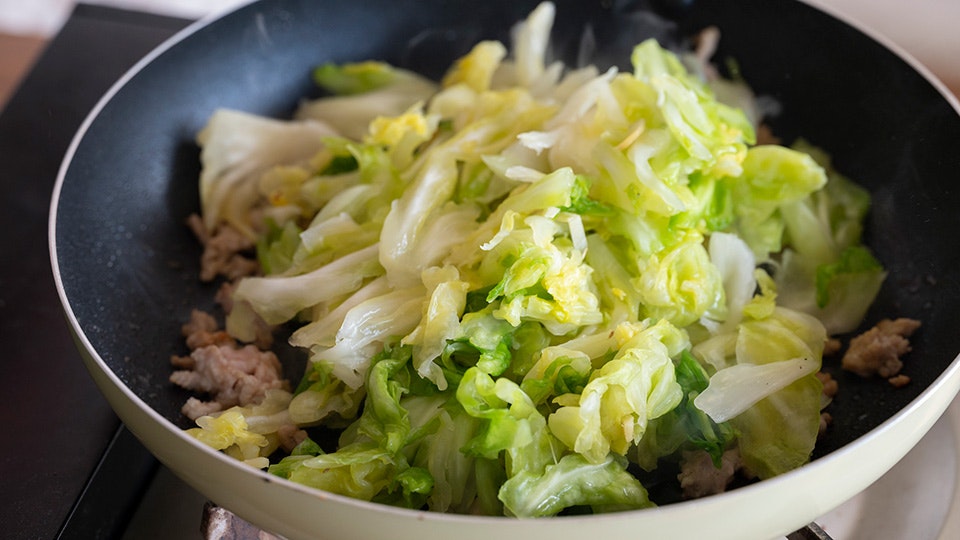 さっと加熱するだけで、あっという間にできあがり。「さらに、くったりキャベツが好きな方は、2分ほど煮込んでいただいてもよいと思います」