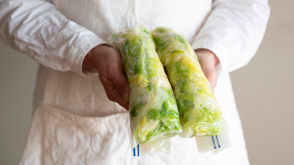 漬物は、簡単に言えば『いかに水分を出すか』がポイントです。昔ながらのやり方だと重石を使ったり、大きさの違うボウルを重ねたり。ただ難しいお宅も多いと思うので、その場合はジッパー付きの保存袋が便利です」