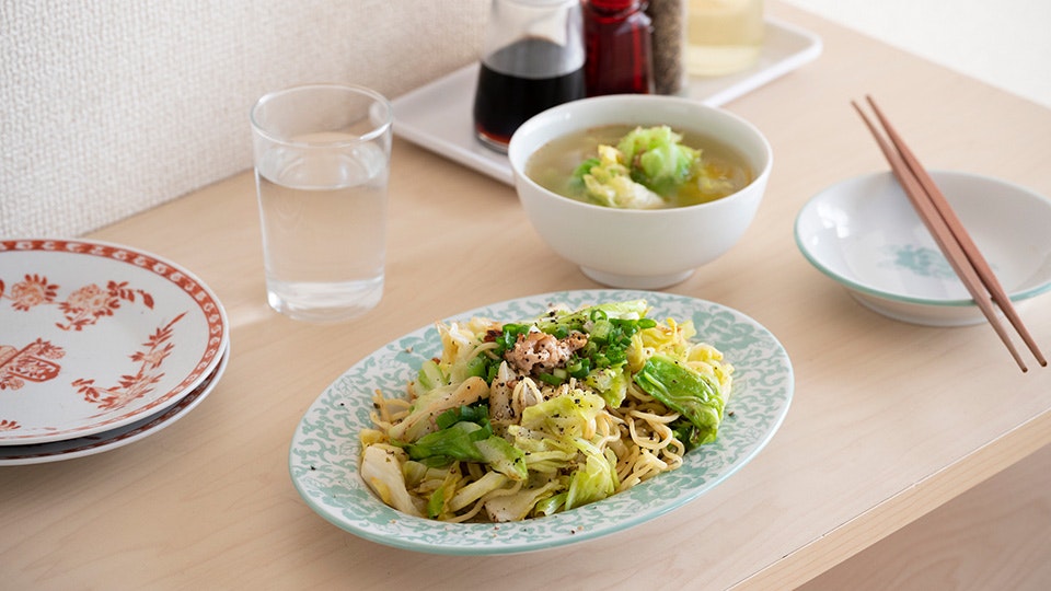「キャベツがたっぷりな分、焼きそばは2人前で1袋にしても十分、糖質の少ないローカーボメニューになりますよ」。しっかり炒めるというより、さっと加熱する程度で大丈夫。