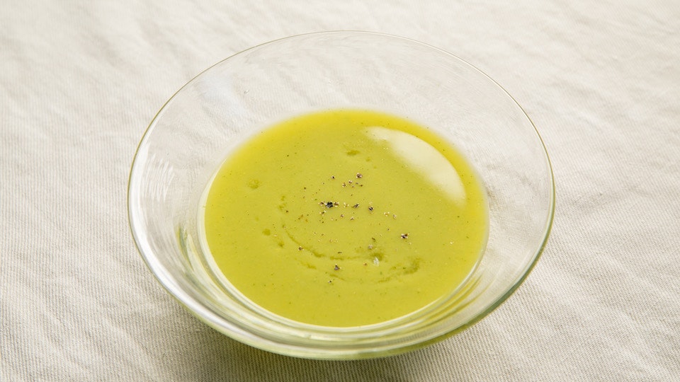 「とうもろこしとズッキーニのスープ」は茅乃舎だしの風味が生きた"すりながし"です。"すりながし"と聞くとハードルが高く感じるかもしれませんが、広沢さんに教わってみるととっても簡単。ミキサーやフードプロセッサーがご自宅にある方はぜひぜひ試してみてほしいメニューです。