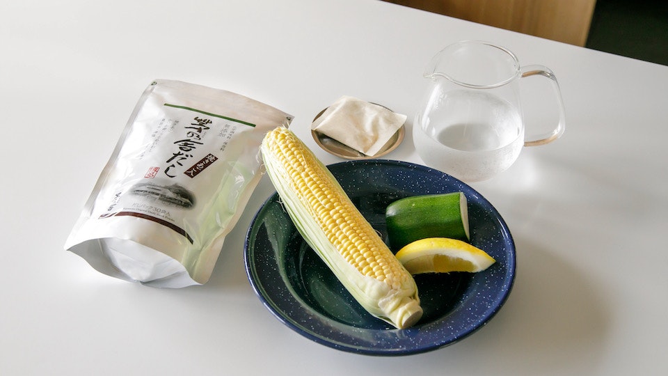 ② 鍋にとうもろこし、ズッキーニ、茅乃舎だし、水300mlを入れ中火にかける。沸騰してきたら弱火にして落とし蓋をして5分煮る。