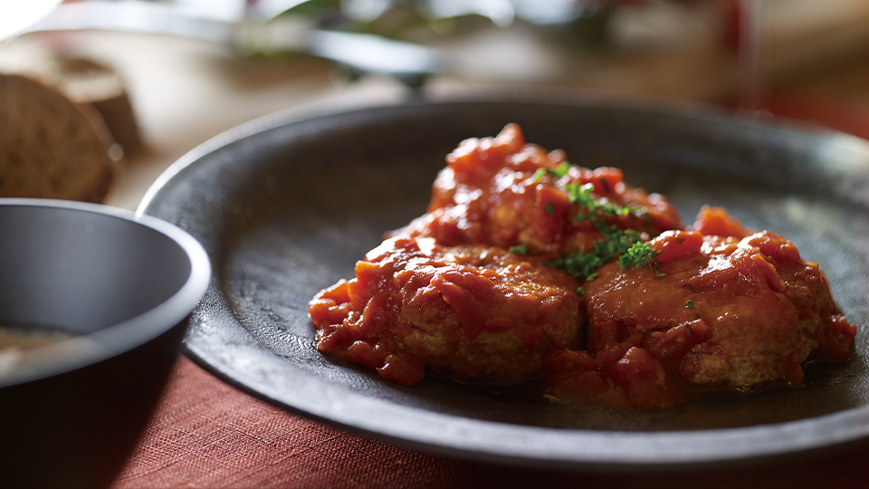 「やさしい和漢だし」のトマトソースは煮込みハンバーグはもちろん、パスタやチキンライスなど料理のバリエーションが広がります。