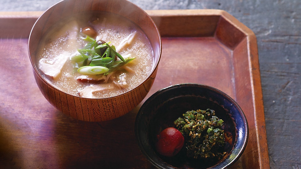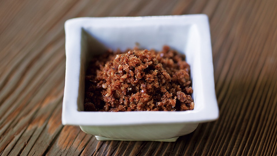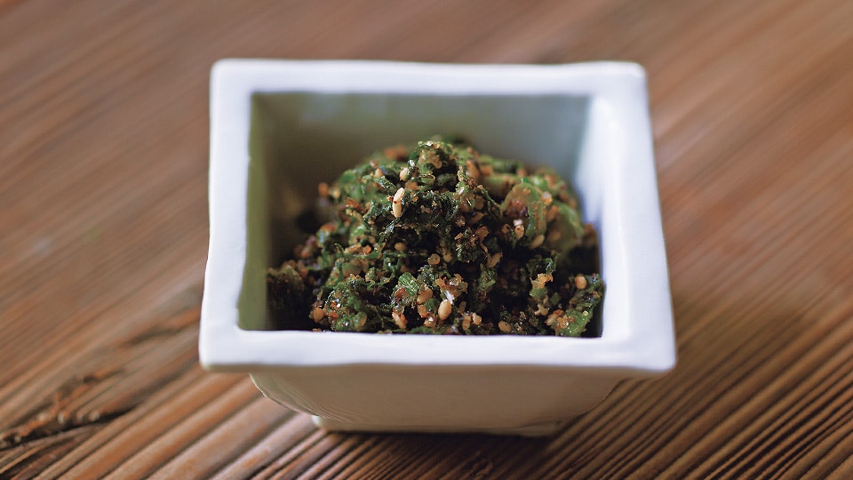 炊きたての土鍋ごはんに添えるのは、塩、わさび、ごま、海苔。そんなシンプルな食べ方を愛する近藤さんが茅乃舎のだし各種の〝だしがら〞でつくる、素朴なふりかけを考案してくださいました。だしをとった後にぱぱっと手早くつくれるのもいいところ。「だしの味も風味もしっかり残っています。これからはもったいなくて捨てられないですね」。少しだけてまひまをかけた、味噌汁と一緒にどうぞ。