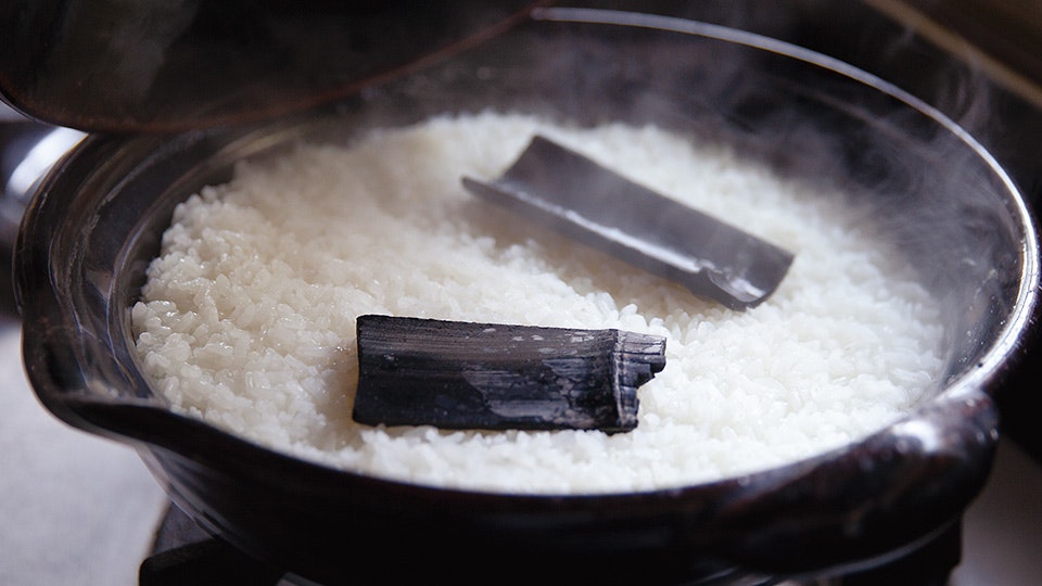 近藤さんはお米を炊く時に米農家さんから分けてもらった竹炭を入れています。炭は水道水のカルキ臭や米のヌカ臭さを吸着するので、炊きあがりの味がよくなるそうです。