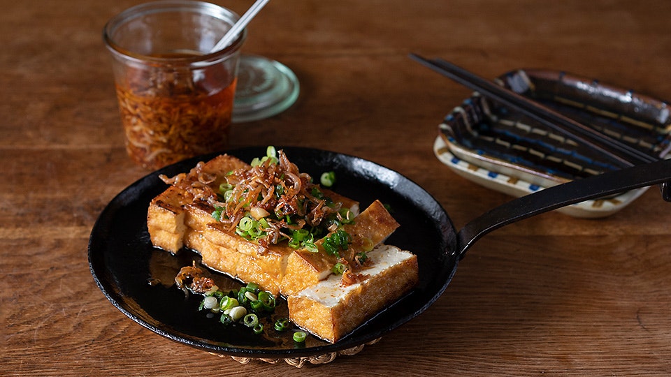 そして薬味厚揚げ。香ばしく焼いた厚揚げに万能ねぎをたっぷりかけ、しらすラー油をかけます。