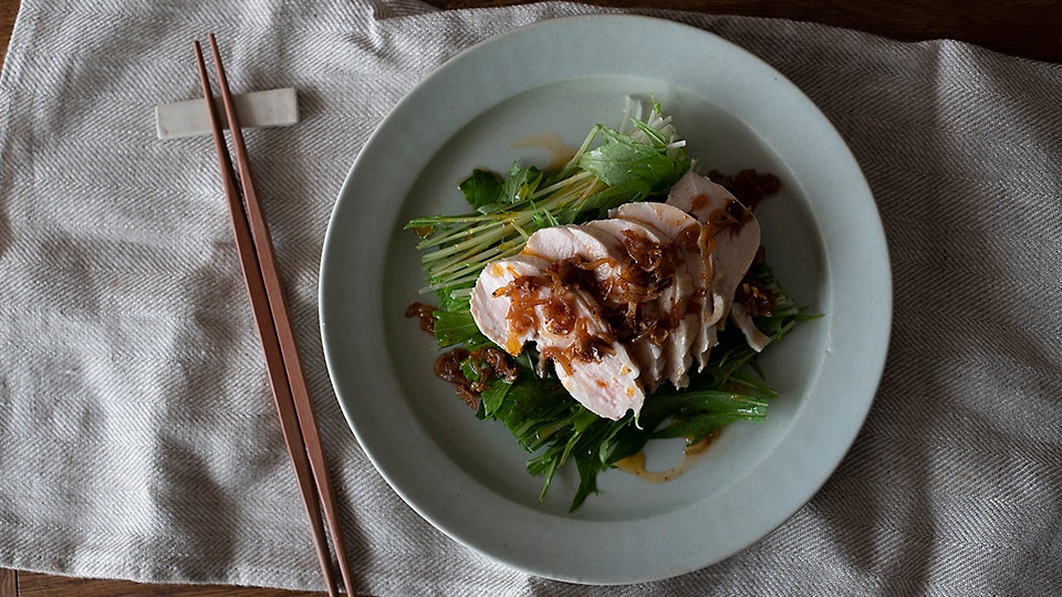 こちらも茹でた鶏むね肉に水菜を少し添え、しらすラー油をかけるだけ。