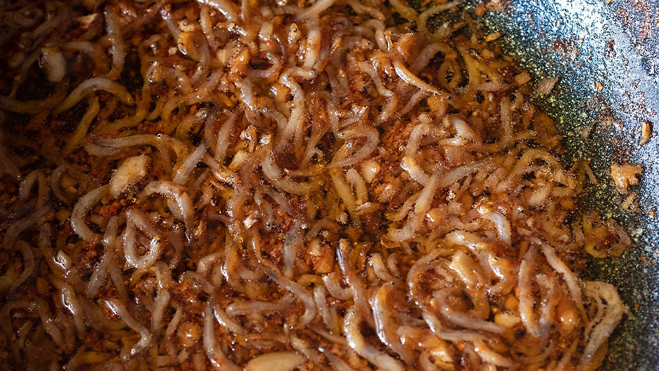 ジワジワしてきたら火を弱め、香りが出てきたら、しらす、醤油を入れます。ときどき混ぜ、5分ほど加熱ししらすに醤油色がついてきたら、袋を破った茅乃舎だし、一味唐辛子を入れ混ぜ、火を止めます。