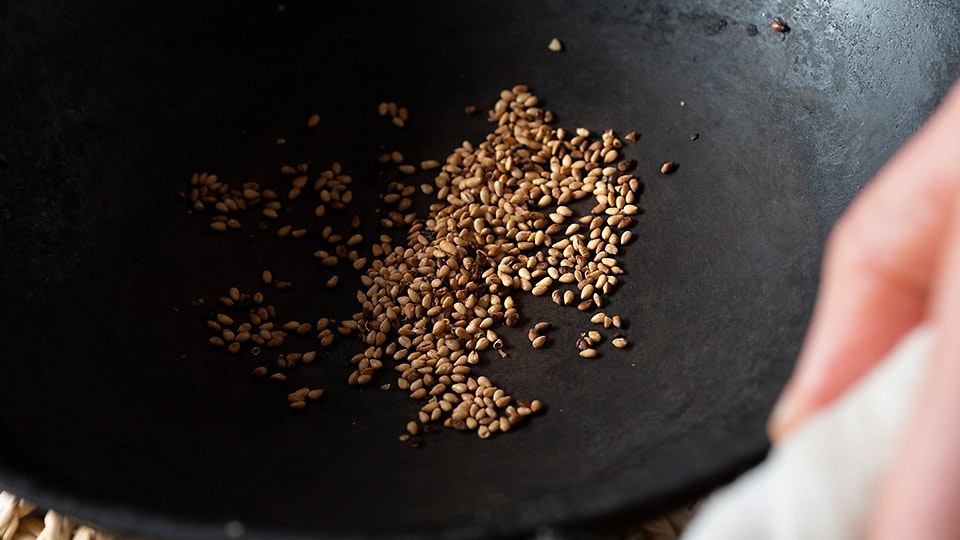 仕上げのポイントは胡麻。炒って香ばしさをプラスします。