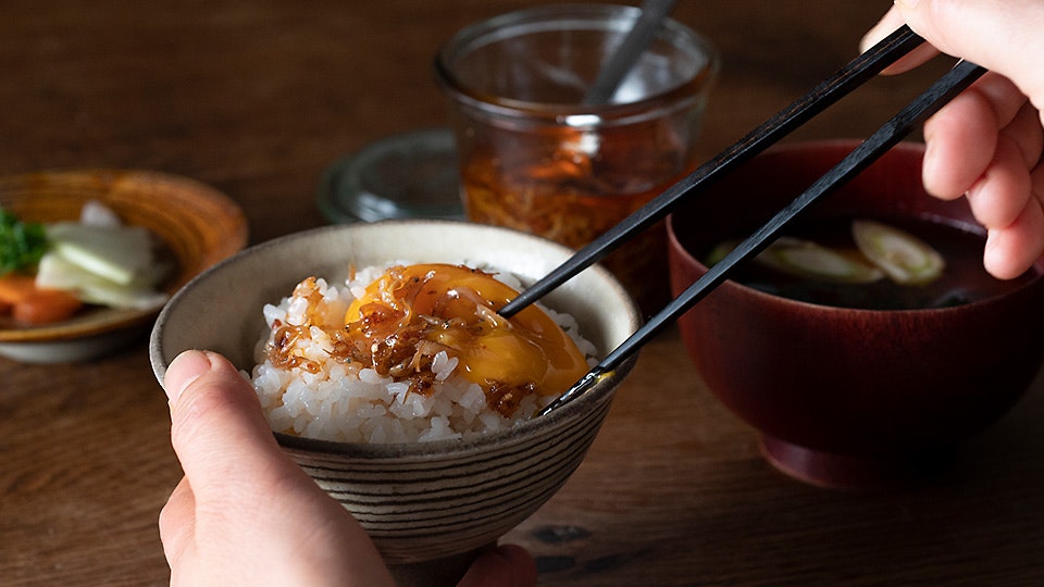あったかごはんに、生卵としらすラー油をかけるだけ。「卵がないときは、ラー油だけでもおいしくいただけます」