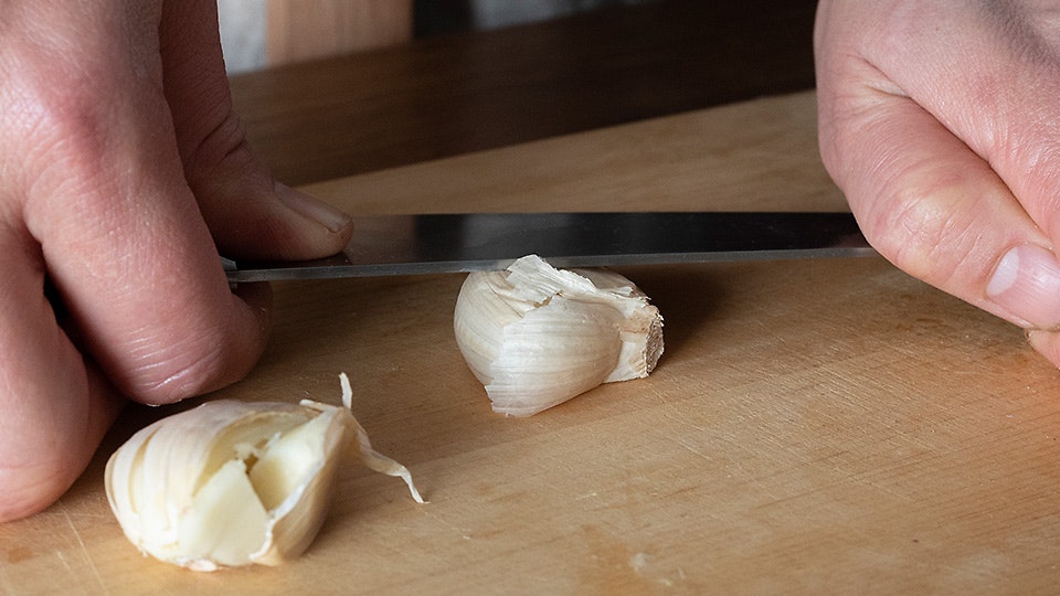 まず、生姜とにんにくをみじん切りにします。「にんにくは包丁で先につぶしておくと、皮がむきやすいですよ」