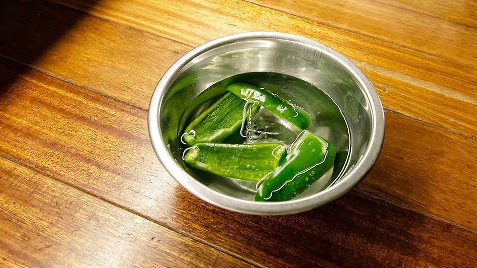 「こっちでは親鶏も、けっこうスーパーで手に入るんですよね」と畑さん。鶏食文化がさかんな九州では、若鶏のみならず、成長した親鶏も一般的。身が締まった歯ごたえと、じゅわりと脂のうまみが特徴です。さらにパリパリピーマンは“パリピー”とも略され、地元の飲食店で流行している食べ方。氷水で冷やすことで苦みを感じにくく、フレッシュな食感も楽しめます。