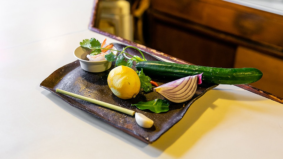 そんな橋本さんに使っていただいたのが、茅乃舎の海老だし。「海老のうまみ、タイでは『カピ』と言われる発酵調味料を使うのですが、海老だしでもかなりその感じが出ますね。入れないと入れるのとでは全然違うと思います」