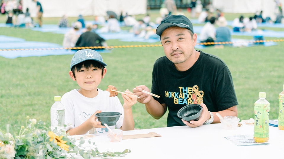 札幌からお越しくださったご家族。料理に出てきた豚丼がおいしかった!とお姉ちゃん。「子どもが食べることが大好きなので、安心安全なものを食べさせてあげられるかなと思って、参加しました。」