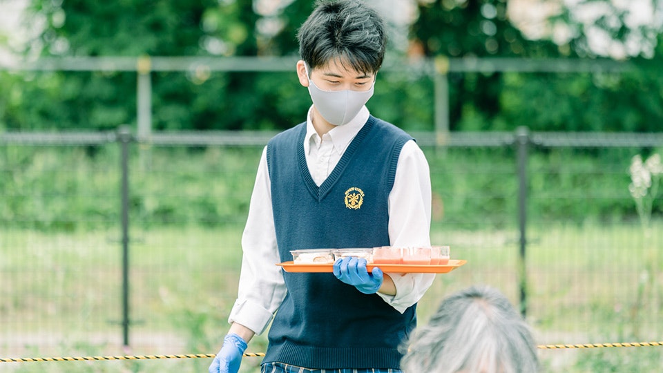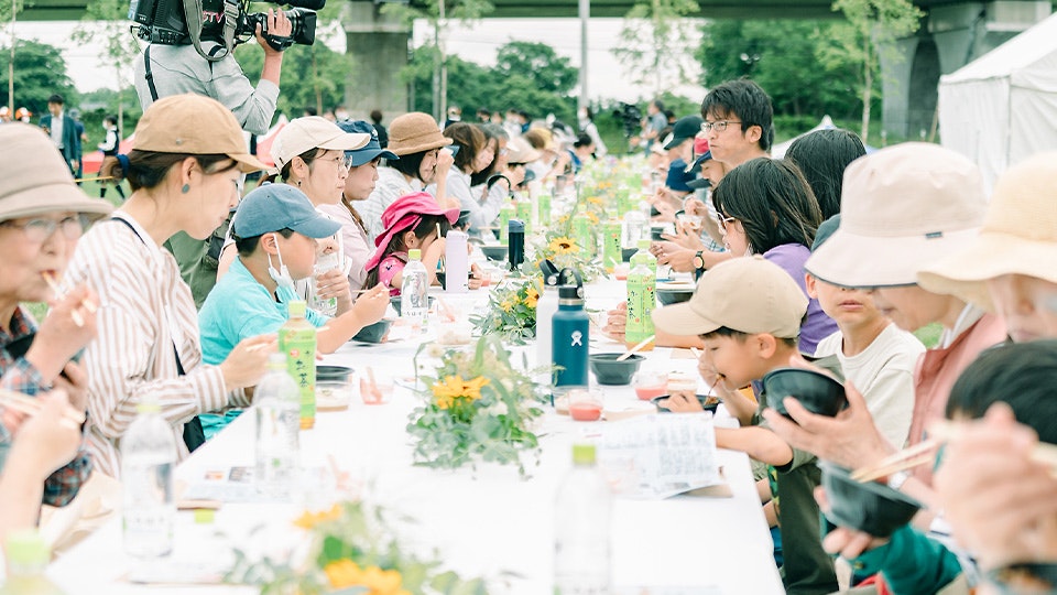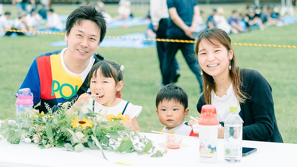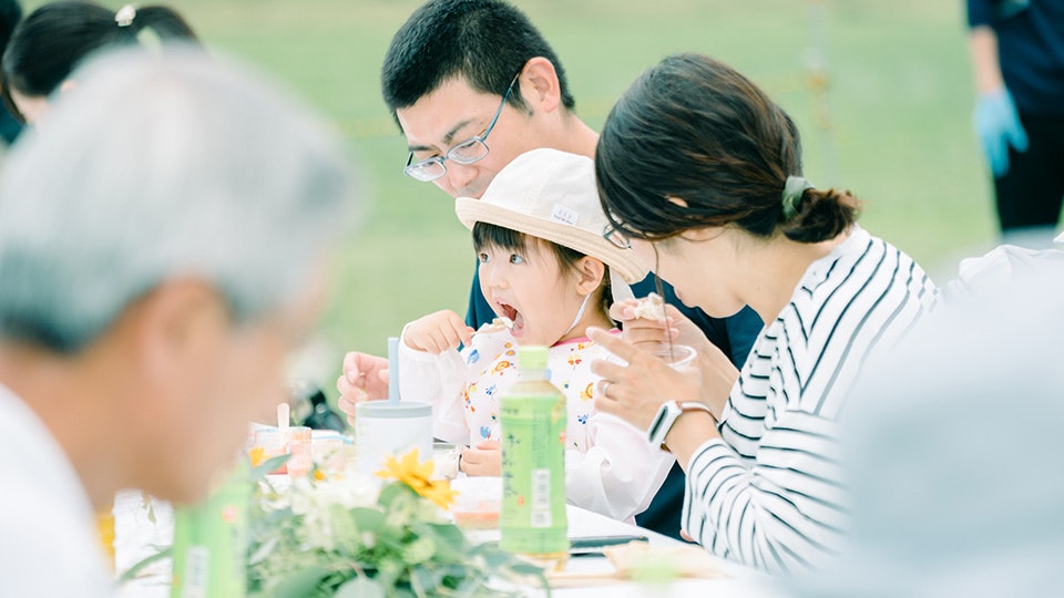 みんなでワイワイ、おいしいものを食べて時間を過ごしたいと企画。当日は天気が心配されましたが、午前中には青空が広がる時も。100人みんなで手を合わせて「いただきます!」の号令とともに、ご家族やご友人同士、隣りに居合わせた方々同士、会話が弾ませながら食事のひとときを楽しんでいただきました。