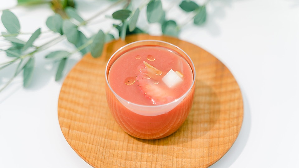 恵庭産フレッシュ王様トマトと、酸味が効いた採れたてのルバーブでつくった冷製スープ。 トッピングには、恵庭「余湖農園」さんの蕪の浅漬け、「島田農園」さんの苺すずあかねを使用しました。北海道の野菜を詰め込んだ、さっぱりとおいしい初夏の味です。