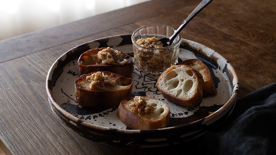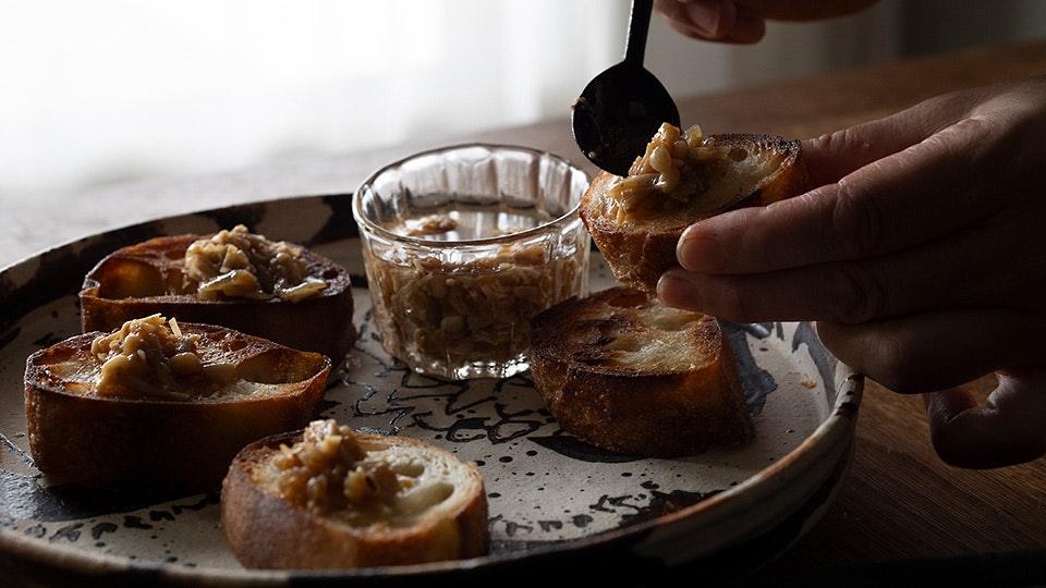 スライスしたバゲットに、きのこオイルのオイルのみ少しかけ、オーブンかフライパンで焼きます。