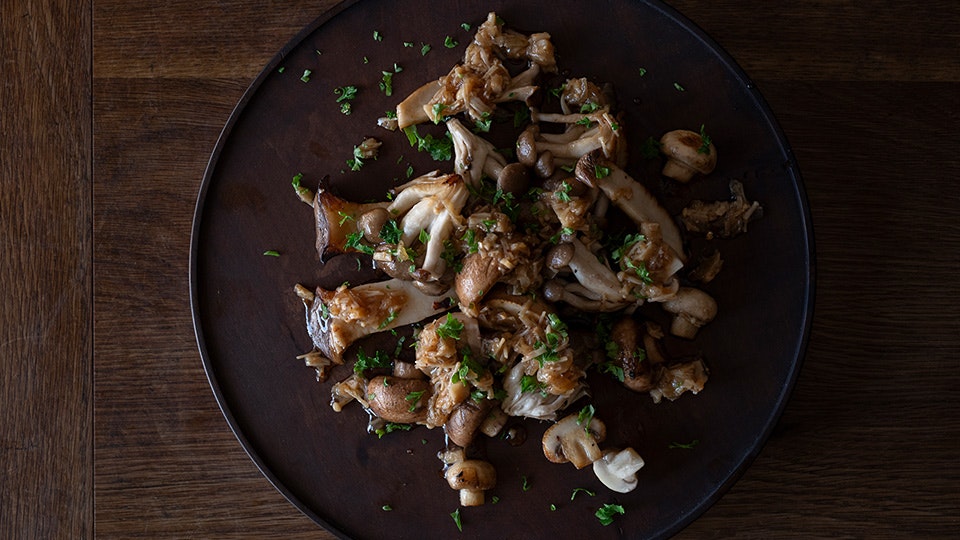 みそきのこだしオイルの、オイルのみをフライパンで熱してきのこを炒め、仕上げにみそきのこだしオイルとパセリ(なくても可)をかければできあがり。