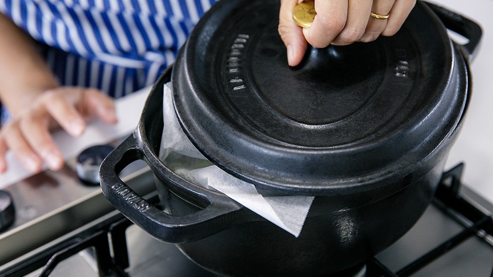 「しっかりとふたを閉めると、素材の味がぎゅっと閉じ込められる分、肉のくさみもこもりがち。蒸し煮にしたい場合にはいいのですが、私は最近、オーブン用シートで落とし蓋をしてから、重いふたを少しずらして煮込むようにしています。そのほうが味がクリアになるので、好きなんですよね」