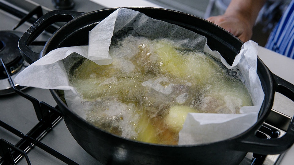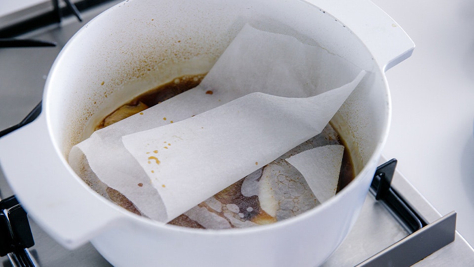 ちなみにオーブン用シートは、鍋の大きさに切る必要はとくにないとか。「要するに水分が飛ばないように、表面にひたひたにさせればいいだけなので」