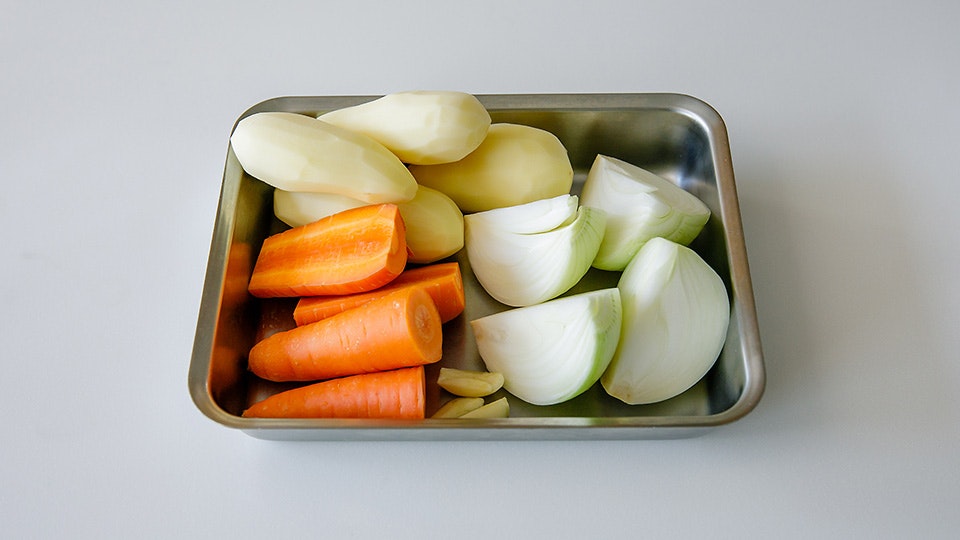 玉ねぎは4分の1、人参は縦に半分、じゃが芋は皮を剥いてまるごと、そのまま。