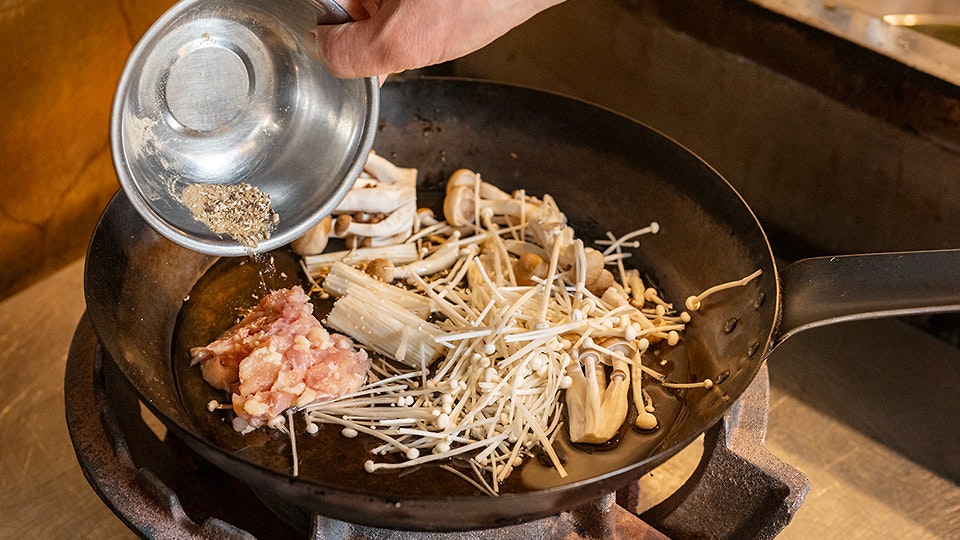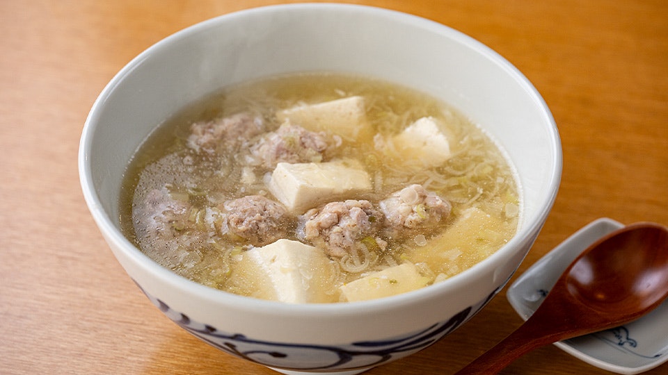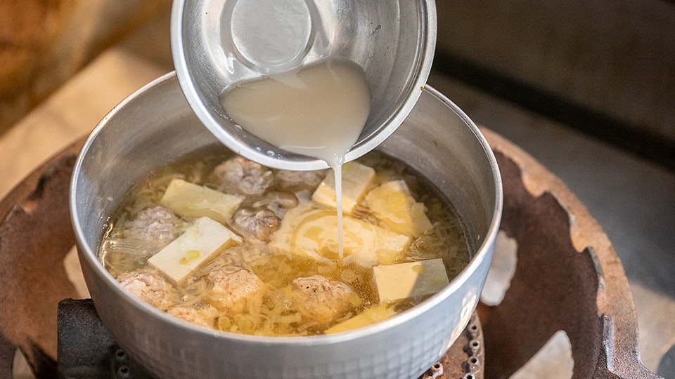 温めただしにつくねを落とし、豆腐を加えて味を整え、とろみをつければ完成。お好みで柚子胡椒の辛みを効かせます。ピリッと辛みのアクセントが大人味。