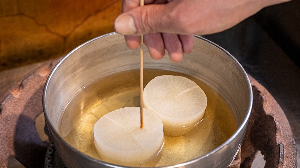まずはコトコトとだしで大根を炊く料理から。大根を炊いただし汁には大根の甘みも染み出ています。それを使ってあんをつくるというおいしさを重ね合わせるレシピです。